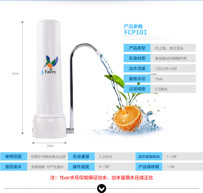 產(chǎn)品類型:臺上型,獨立龍頭,機身材質(zhì):食品級ABS樹脂外殼,出水流量:120公升/小時,最低水壓:1bar,過濾的精度:0.5微米,使用的范圍:僅用于市政自來水過濾,機身重量:1.45kg,濾芯使用壽命:1-2年,是否廢水:無需用電,不產(chǎn)生廢水,操作的溫度:5-38度,產(chǎn)品保修期:一年