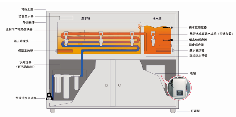 ■雙層熱水冷卻和全封閉不銹鋼節(jié)能熱交換器雙重冷卻系統(tǒng),蒸汽冷卻回收 系統(tǒng),高溫紫外線殺菌系統(tǒng)連續(xù)提供健康溫白開水。